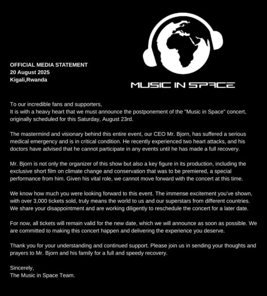 Itangazo ryashyizwe ku mbuga nkoranyambaga za Music in Space rigenewe abanyamakuru basobanuye ko umuyobozi wayo Bjorn yabazwe umutima ku buryo abaganga bamubujije kugira igikorwa ry’imyidagaduro yitabira atarakira neza.