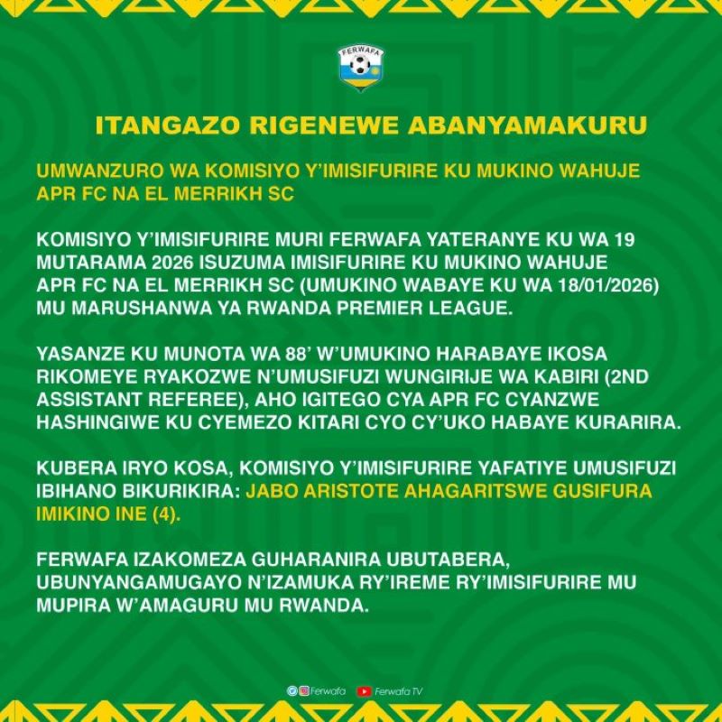 Mu itangazo ryashyizwe hanze, FERWAFA yavuze ko umusifuzi Jabo Aristote yahagaritswe gusifura imikino ine yikurikiranya, igikorwa cyafashwe nk’intambwe igamije gusigasira ubutabera n’ubunyangamugayo mu misifurire.