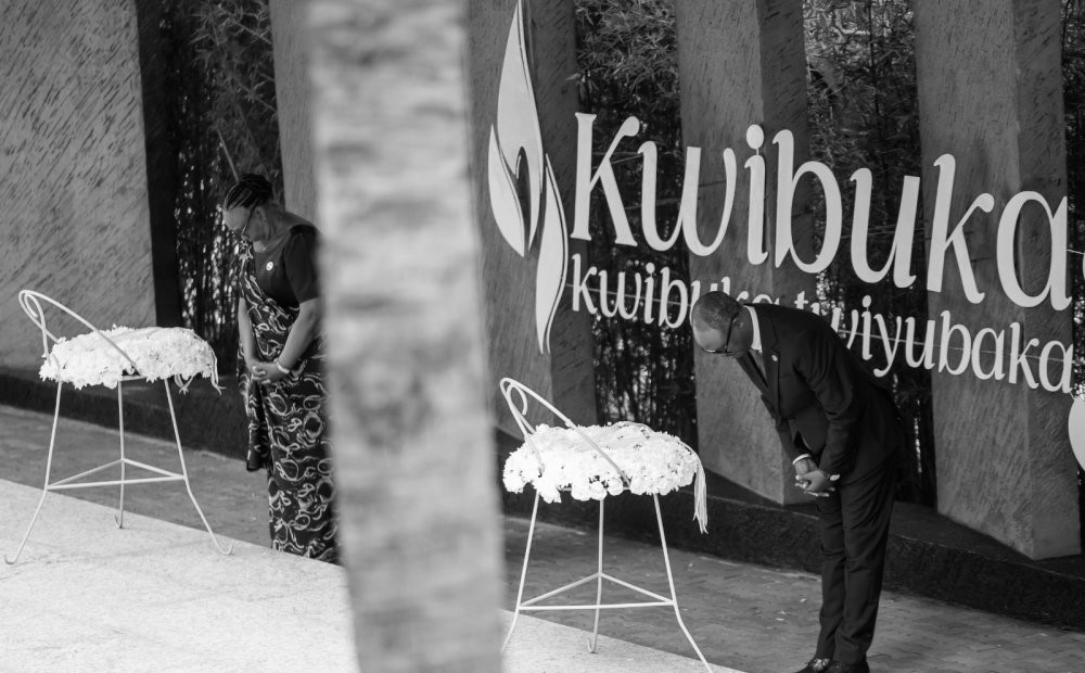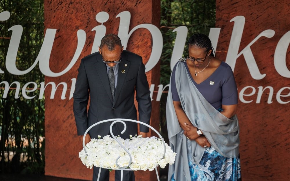 Mbere yo gucana urumuri rw’icyizere ruzamara iminsi 100, Perezida Kagame na Madamu Jeannette Kagame babanje gushyira indabo ku mva rusange ndetse banunamira imibiri y’inzirakarengane za Jenoside yakorewe Abatutsi ishyinguye ku Gisozi.