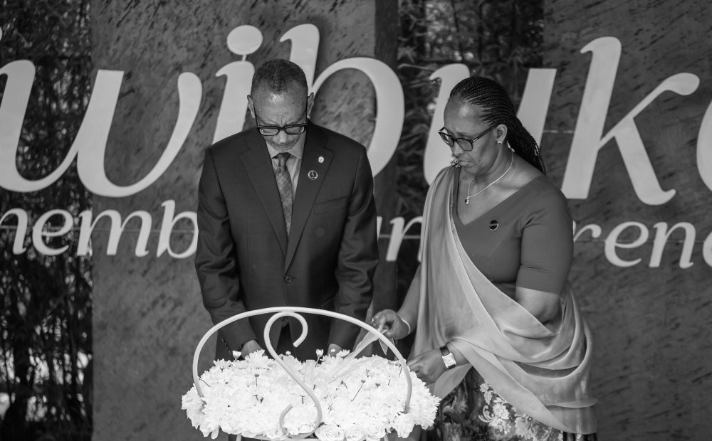 Mbere yo gucana urumuri rw’icyizere ruzamara iminsi 100, Perezida Kagame na Madamu Jeannette Kagame babanje gushyira indabo ku mva rusange ndetse banunamira imibiri y’inzirakarengane za Jenoside yakorewe Abatutsi ishyinguye ku Gisozi.