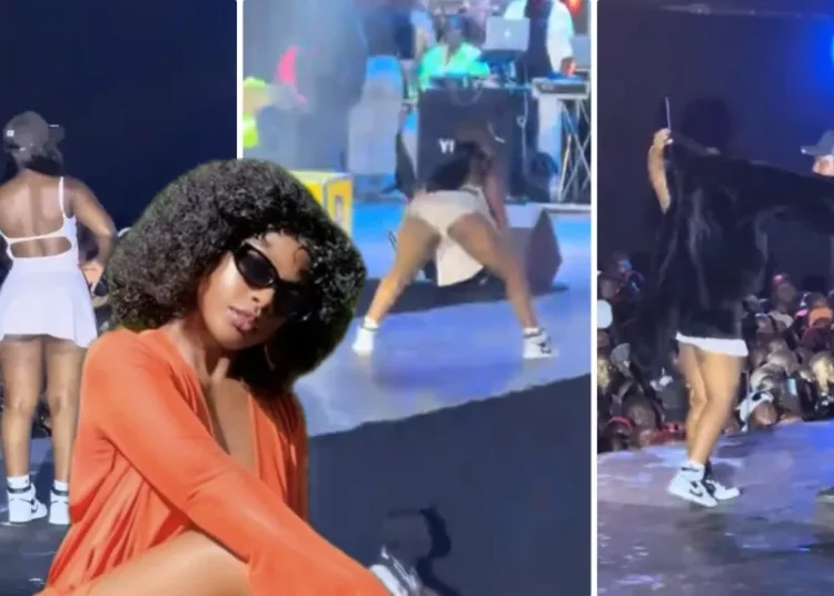 Winnie Wa Mummy ubwo yajyeraga ku rubyiniro mu rwego rwo kwifatanya n’umuhanzi Mudra mu kuririmba indirimbo bahuriyemo, ibi byabaye mu mpera z’igitaramo cya Mudra.